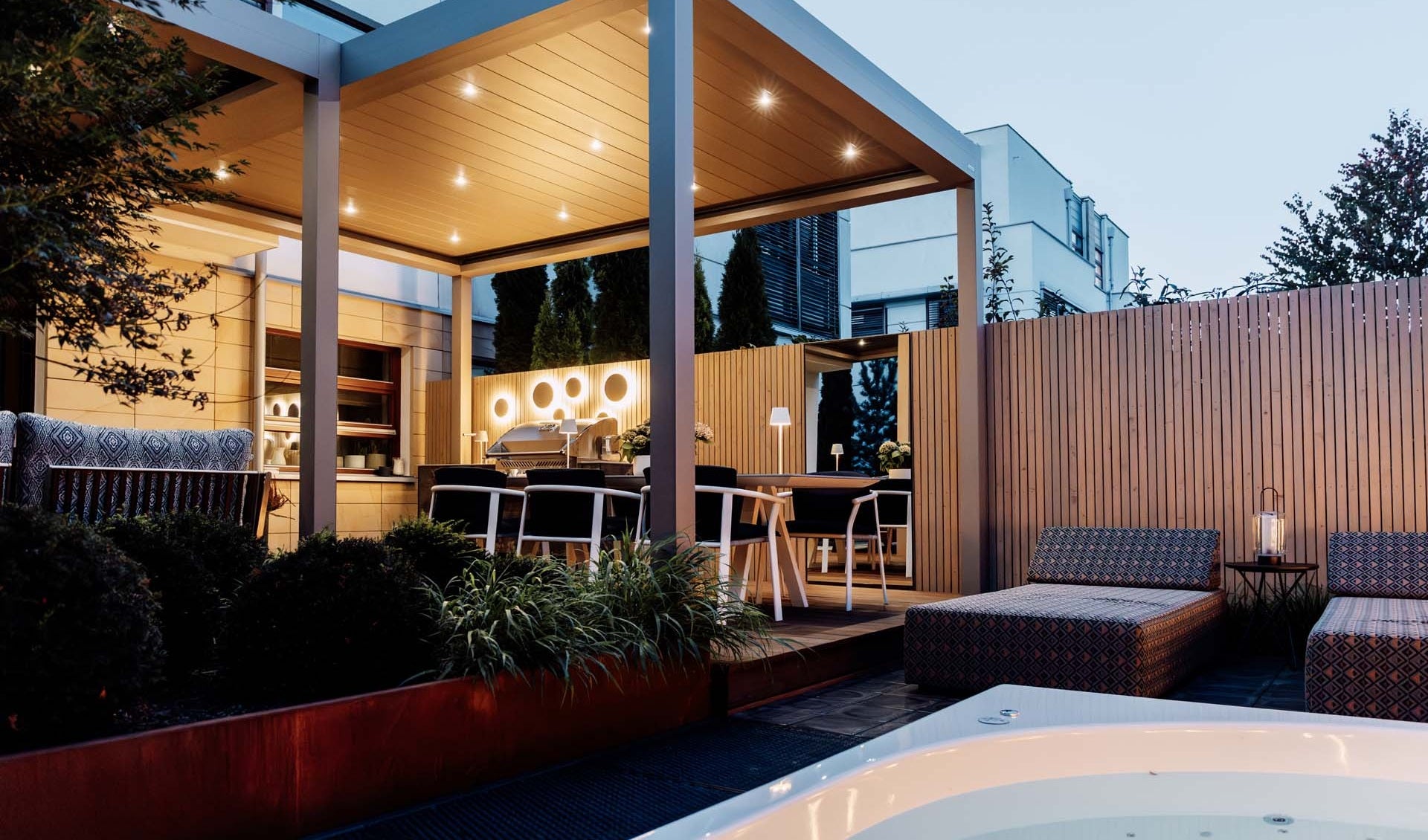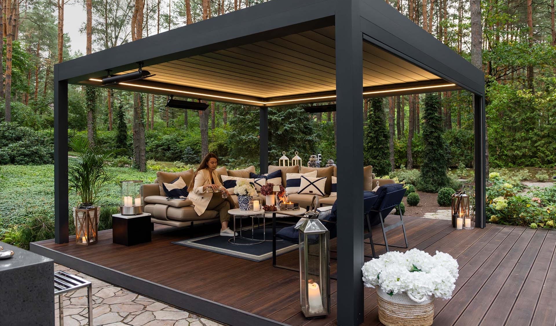 De noggrant konstruerade lamellerna hjälper till att reducera värme, skydda mot regn och hantera snöbelastning, vilket gör pergolan anpassad för nordiskt klimat. Modellen är dessutom förberedd för full sidoinbyggnad och kan utrustas med ett brett utbud av tillbehör för att skapa maximal komfort och funktionalitet.